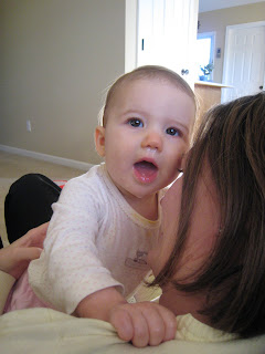 A giant blur because she is serious about being on the move, and secondly, we seem to constantly be busy (although I'm not sure doing what). So, this morning I woke Emerson up to find that both of her eyes were crusted shut and one was swollen so much she could barely open it. This certainly can't be good. So I volunteered to take the day off of work to take Emerson to the doctor to find out what was going on, and luckily we were able to get in at 10am. The diagnosis: Pink Eye. Yuk! Apparently, someone at her daycare was out one day last week with the same thing. Great. We were instructed to keep her out of daycare for two days, so she'll be going back on Wednesday, and Ryan will stay home with her tomorrow. Thus, I am able to update our blog at noon on a Monday.